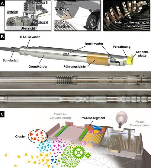 Photo: Current fields of research at the Institute of Machining Technology ISF of the Technical University of Dortmund: Determining cutting surface temperatures during operation (A), implementing smaller bores even at great depths (B) and simulation-based prediction of process behavior (C).(Source: Institute for Machining Technology ISF – Dortmund University of Technology