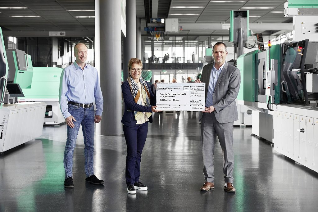 Arburg’s fundraising campaign for refugees from Ukraine, which ran for three weeks, has been a resounding success. The donations made by employees were tripled by the company’s partners, raising a grand total of 150,000 euros. On Wednesday 27 April 2022, Managing Partner Renate Keinath, head of HR at Arburg, and Thomas Brunnenkant, head of the works council, handed over the donation cheque to Reinhard Geiser, deputy district administrator of the district of Freudenstadt.