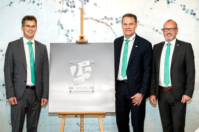 25th anniversary of Arburg Denmark: As high-ranking representatives of the Arburg parent company, Guido Frohnhaus, Managing Director Technology & Engineering (right), and Steffen Eppler, Director Sales Europe (left), handed over an anniversary sculpture to Michael Kylling, Managing Director of Arburg A/S in Greve, on 2 June 2022. Photo: Arburg