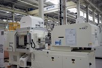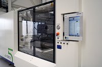 The electrical toggle machine with integrated hydraulics produced 8 cavity syringe barrels (1.5 ml) from Werkzeugbau Ruhla, made out of PP9074MED from Exxon Mobil. Equipped with a laminar flow box, quality flap, and conveyor belt from Petek Reinraumtechnik, it showcased its flexibility for high-precision medical applications. - Electrical Zeres V Series (1500 kN):
