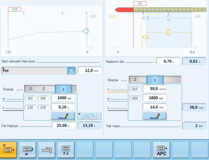 Ovdje su predstavljene dvije glavne faze: faza ubrizgavanja i faza naknadnog pritiska. Između njih je takozvana preklopna točka. Uz ovu snimku zaslona također objašnjavamo ostale koji su važni za optimizaciju procesa brizganja.