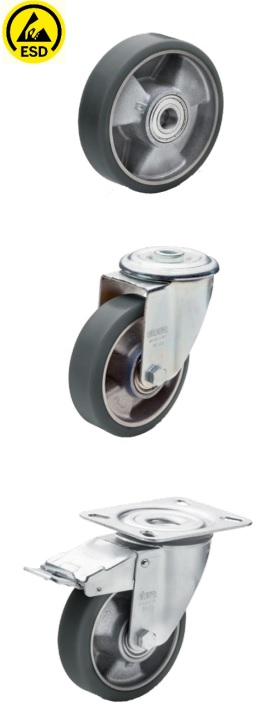 V ponudbi so tako valji in kolesa ESD z ohišjem iz jeklene pločevine za lahka (RE.F5-N-ESD) ali srednja bremena (RE.F5-H-ESD) z ali brez zavor.