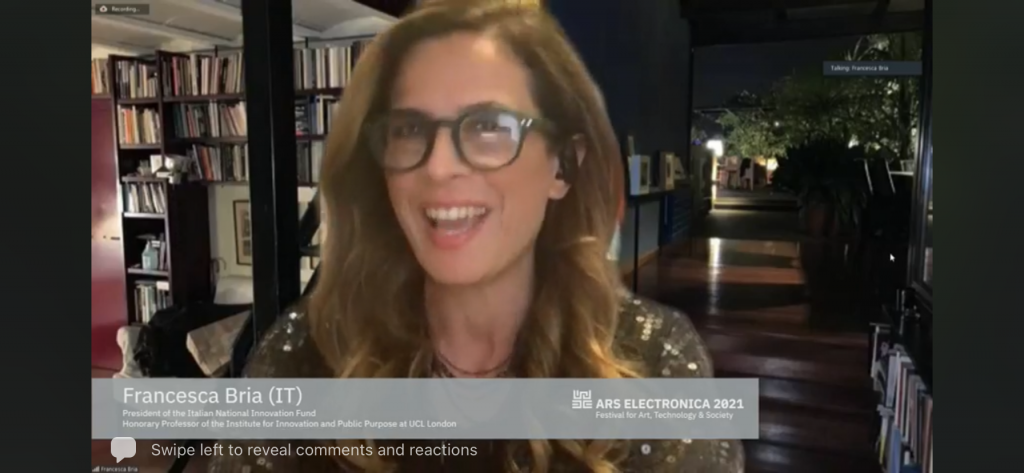 Francesca Bria je predsednica italijanskega nacionalnega sklada za inovacije in častna profesorica na Inštitutu za inovacije in javni namen na londonski univerzi UCL. Je višja svetovalka Združenih narodov (UN-Habitat) za digitalna mesta in digitalne pravice. Francesca Bria vodi projekt DECODE o suverenosti podatkov v Evropi. Je tudi članica strokovne skupine na visoki ravni Ekonomski in družbeni učinek raziskav in inovacij (ESIR) pri Evropski komisiji. Francesca je doktorirala na področju inovacij in podjetništva na Imperial Collegeu v Londonu in magistrirala na področju digitalnega gospodarstva na Univerzi v Londonu, Birbeck. Poučevala je na več univerzah v Združenem kraljestvu in Italiji ter svetovala vladam ter javnim in zasebnim organizacijam na področju tehnološke in inovacijske politike ter njenega družbenoekonomskega in okoljskega vpliva. Foto: zajem zaslona