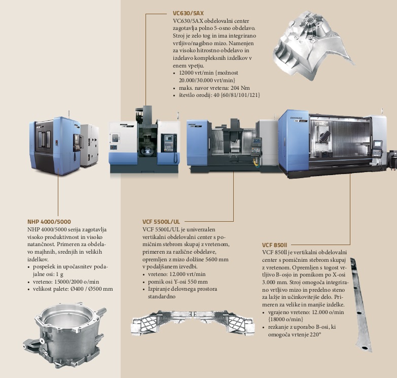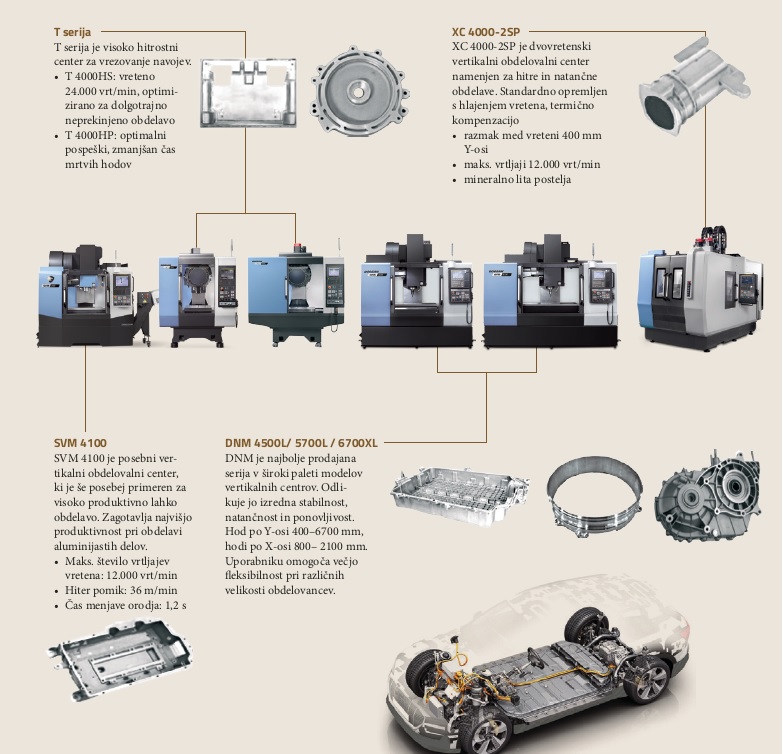 Zaradi potrebe po izdelavi kompleksnih komponent za električna vozila je Doosan Machine Tools okrepil in izboljšal linijo 3-osnih in 5-osnih CNC-strojev. Doosan Machine Tools je za povečanje konkurenčnosti ponudbe pristopil k dvosmerni strategiji. Izboljšali so uporabnost obstoječih modelov strojev in razvili nove stroje, ki so posebej primerni za strojno obdelavo komponent električnih vozil.