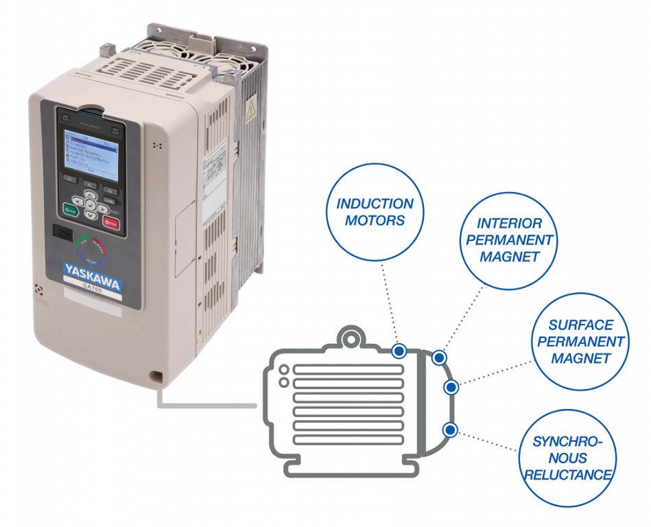 Frekvenčnik_tipi_motorjev_Yaskawa_Tipteh-1Z GA700 lahko natančno krmilite različne tipe motorjev: indukcijske, s trajnimi magneti in reluktančne. S svojo vsestranskostjo vam zagotovi izvajanje širokega spektra aplikacij z enim samim frekvenčnikom. Še več, na račun EZ vektorskega načina lahko omenjene tipe motorjev poganja brez obsežnih ponastavitev.