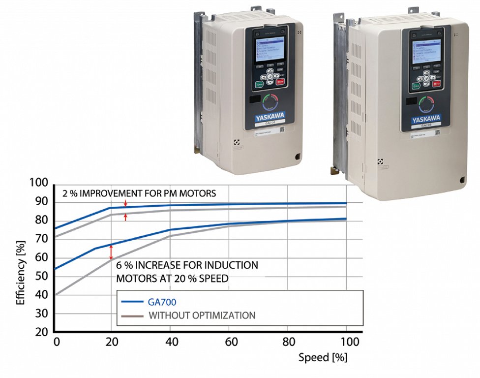 • Vrhunska zmogljivost pogona; GA700 vam z vgrajenimi najnovejšimi tehnologijami krmiljenja zagotavlja maksimalno zmogljivost pogona ob minimalni porabi energije različnih motorjev (indukcijskih, s trajnimi magneti, reluktančnih).