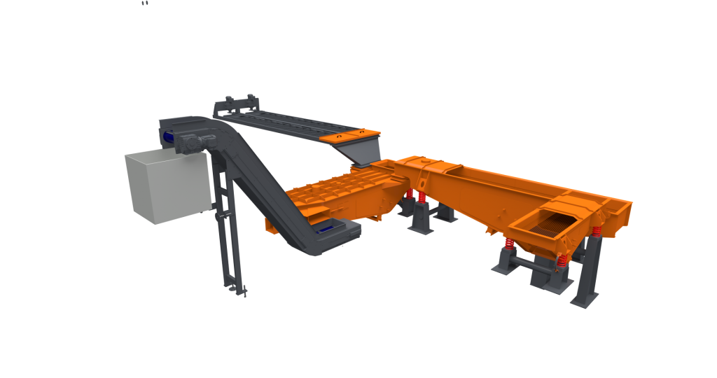 Prečni žleb vodi medij za peskanje v prenosni zalogovnik, ki je povezan s centralnim sejalnim sistemom pod komoro peskalnega stroja. Na izhodu iz komore stroja za peskanje strgala potiskajo ostanke livarskega peska in medija za peskanje v centralni sejalni sistem pod komoro, kjer se ločijo večina livarskega peska in drugi ostanki litja, ki jih robusten transportni trak odstrani iz stroja za peskanje. Sejalni zalogovnik z elevatorjem transportira preostalo mešanico livarskega peska in medija za mešanje v visoko učinkovit sistem za čiščenje medija za peskanje. To napravo sestavlja dvostopenjski magnetni ločevalnik in sistem za spiranje z zrakom, kar omogoča visoko učinkovito čiščenje ter tako zagotavlja brezhibno delovanje in hkrati zmanjšuje obrabo stroja za peskanje. Po ročni namestitvi ulitkov protiuteži za viličarje jih poberejo vozički zmogljivega transportnega sistema ter v določenih časovnih intervalih premaknejo skozi različne dele stroja za peskanje.