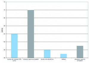 Raven hrupa pri brizgalkah določa standard DIN EN 201:2009, dodatek K. Pri hidravličnih strojih emisija hrupa lahko presega 70 dB (A), pri električnih pa je občutno manjša: emisija hrupa stroja serije IntElect proizvajalca Sumitomo (SHI) Demag Plastics Machinery GmbH je samo 59 dB (A). Vendar pa lahko tudi hidravlične brizgalke omogočajo razmeroma mirno okolje, če proizvajalec stroja že pri razvoju stroja sledi načelu čim nižjih emisij hrupa. Tako so pri hidravličnih strojih serije Systec Sumitomo (SHI) Demag serijsko vgrajene električne regulacijske črpalke tipa DFEE v povezavi s pogonskimi motorji visoke zmogljivosti. Zato je emisija hrupa pri obratovanju stroja Systec 210 z zapiralno silo 2100 kN in 560 mm prečne širine samo 64 dB (A). Še manj hrupa se doseže s pogonskim konceptom activeDrive, ki emisije hrupa stroja Systec 210 (2100 kN zapiralne sile, 560 mm prečne širine) zniža do 60 dB (A). Inovativni koncept pogona activeDrive s frekvenčno regulacijo omogoča dinamično prilagajanje potrebam, s čimer niso manjše samo emisije hrupa, ampak se porabi tudi za 30–60 odstotkov manj energije.