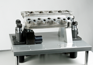 Na sliki lahko vidimo vpenjalno pripravo z elementi serije ROEMHELD E-TEC za glavo cilindra, ki je popolnoma brez hidravličnih komponent