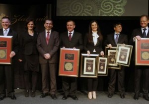 Na sliki so Marko Lotrič, direktor podjetja Lotrič Meroslovje, Suzana Rankov, odgovorna urednica Dnevnika, Janko Veber, predsednik državnega zbora, Jasna Mihelj Coustaury, svetovalka direktorja v podjetju Aviat, Andrej Božič, generalni direktor Steklarne Hrastnik, Janez Škrabec, direktor podjetja Riko. Za najboljše zaposlovalce Zlate niti 2012 so bili prepoznani Lotrič Meroslovje, Krka in RIKO.