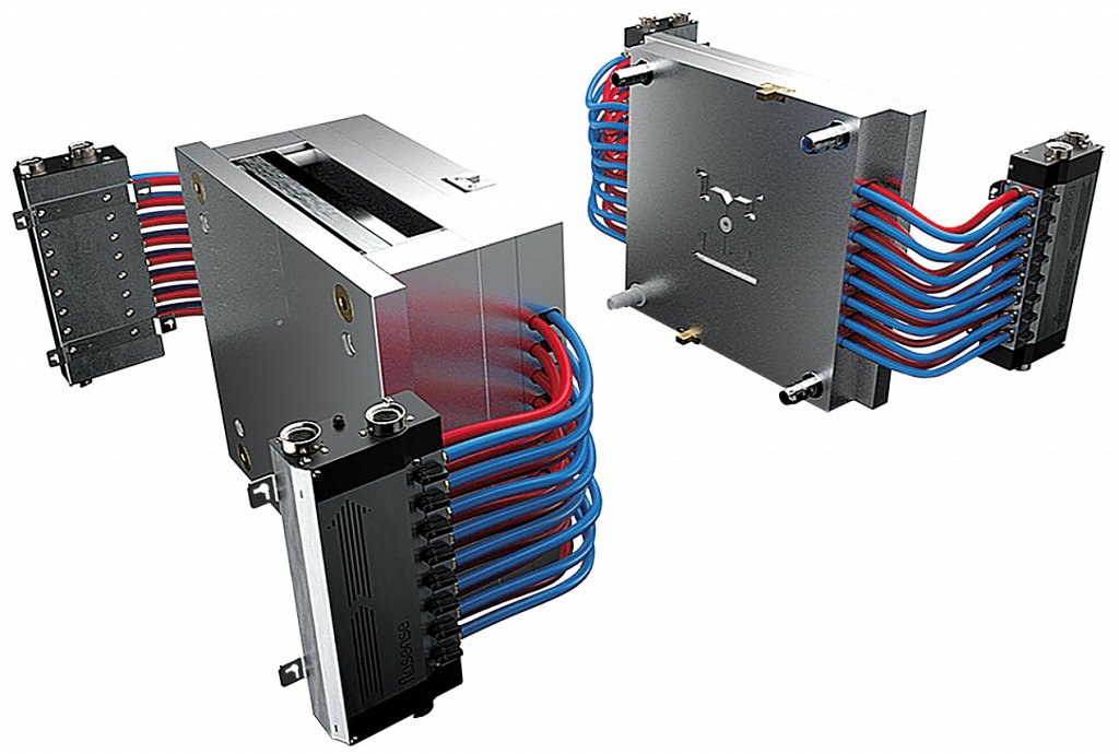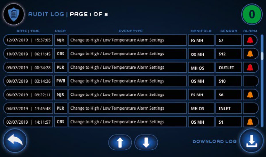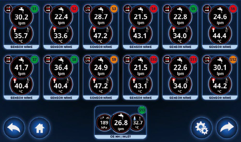 Na zaslon občutljiv na dotik lahko priklopimo do 4 razdelilnike s katerimi lahko nadziramo do 48 posamičnih hladilnih tokokrogov. Uporaba alarmnih obvestil (in izhodov) za pretok in temperaturo za nadzor stabilnosti procesa in kakovosti izdelka.