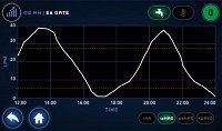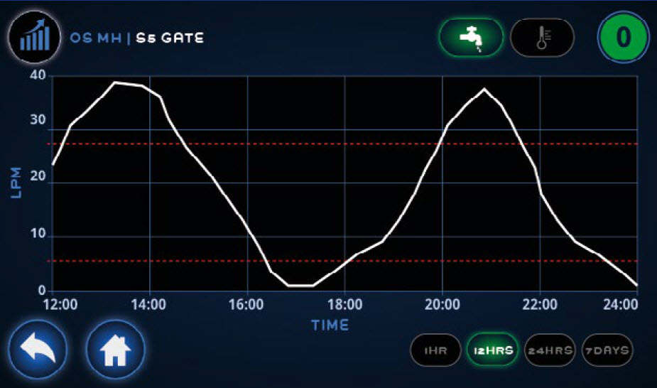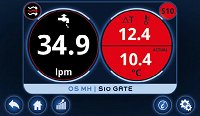 Glavni zaslon prikazuje vse tokokroge z informacijami o pretoku in temperaturi. Glavni vhod in izhod prav tako prikazuje vključen pritisk.