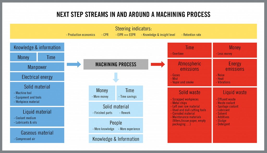 Učinkovita proizvodnja omeji potrato časa, energije in surovin na minimum. Težave, povezane z odpadki, ki nastanejo po strojni obdelavi, kot so odrezki, mazalna olja in hladilna sredstva, so kompleksne. Za proizvajalce so odpadki običajno neizogibna posledica obdelave. Po njihovem mnenju je spremembe težko doseči, zato so minimalne. Miselnost v svetu strojne obdelave je takšna, da "tako pač je in s tem se je treba sprijazniti".