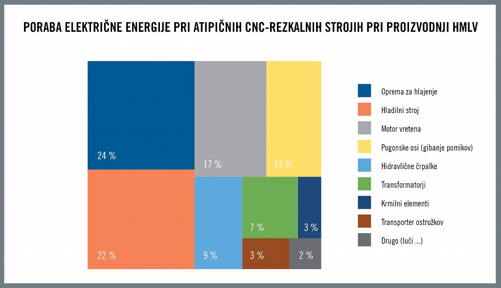 Na sliki 3 je prikazana poraba električne energije v petosnem obdelovalnem centru v enem delovniku (zbrani so podatki samo enega stroja, ki služijo za splošno referenco). Glavno vreteno presenetljivo ne porabi večine energije stroja. Glavno vreteno in motorji z osnim pogonom običajno porabijo samo 30 odstotkov energije, medtem ko različni hladilni sistemi porabijo 44 odstotkov, črpalke, transformatorji, krmilni in drugi sistemi pa porabijo preostanek. Posledično to pomeni, da medtem ko stroj ne reže, drugi njegovi sistemi nadaljujejo s porabo energije.
