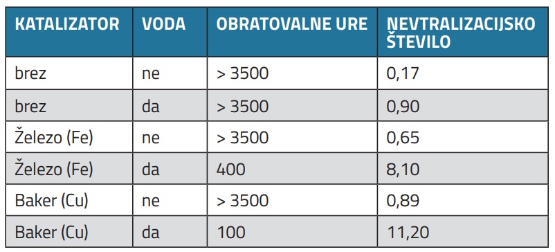 Na podlagi doseženih obratovalnih ur ob prisotnosti različnih katalizatorjev je jasno razvidno, da je najslabša kombinacija prisotnost kovine železa in/ali bakra ob prisotnosti vlage oz. vode. V prikazanih primerih se je število obratovalnih ur drastično zmanjšalo ob prisotnosti enega od katalizatorjev, bodisi železa bodisi bakra in seveda vode.