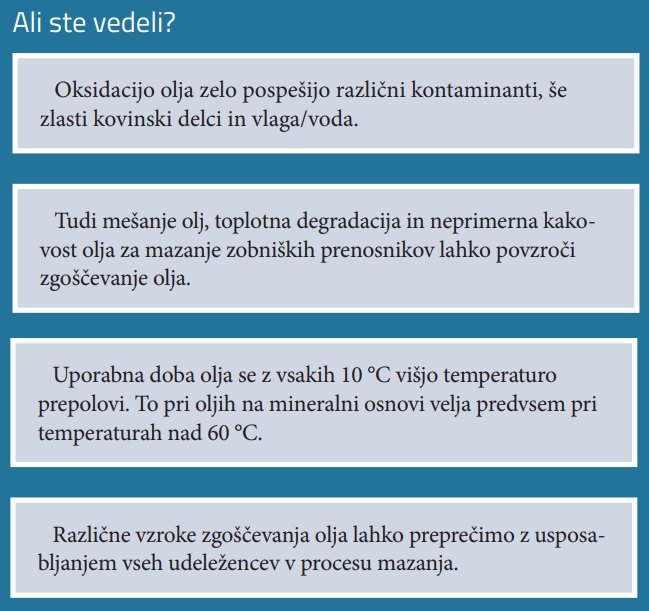 Pred časom smo v Mali šoli mazanja obravnavali olja za mazanje zobniških prenosnikov (št. 72, december 2017). Tedaj je bila glavna tema izbira primerne viskoznostne gradacije olja. Tokrat pa se bomo posvetili vzrokom za zgoščevanje olj, ki jih uporabljamo za mazanje zobniških prenosnikov.