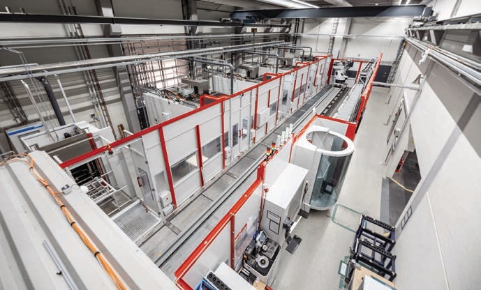 »V podjetju Hofmann izkoriščajo razpoložljiv prostor na optimalen način s sistemom, ki je sestavljen iz štirih obdelovalnih centrov C 42 U, robotskega sistema, enote za čiščenje obdelovancev in merilne sobe. Vir: Hermle
