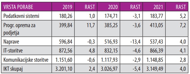 Svetovni trg informacijsko-komunikacijskih tehnologij (IKT) je v letu 2020 upadel za 5,4 odstotka v primerjavi z letom prej, na 2,93 bilijona evrov, ocenjuje analitsko podjetje Statista. V letu 2021 bo trg IKT porasel za 4 odstotke, na 3,05 bilijona evrov. Po anketi, opravljeni v septembru lani, je bila približno tretjina IKT proračuna v Evropi in Severni Ameriki namenjena za strojne projekte. Večja podjetja po navadi namenjajo manjši delež denarja za strojno opremo. Podjetja, ki zaposlujejo 1–99 delavcev namenjajo 35 odstotkov proračuna za strojno opremo, podjetja nad 5000 zaposlenih pa 29 odstotkov. Statista ocenjuje, da velika podjetja del sredstev raje vlagajo v upravljane storitve. Večina podjetij je zaradi pandemije COVIDa-19 zmanjšala porabo za IKT. Posamezna podjetja, ki so delu zaposlenih določila delo od doma, so se soočila z nepričakovanimi stroški za prilagajanje na nove operativne zahteve. V nedavni anketi je 60 odstotkov udeležencev ocenilo, da se je njihov proračun za IKT v letu 2020 zmanjšal, medtem ko je 18 odstotkov ocenilo, da je proračun za IKT porasel. Statista je prav tako napovedala, da bo rast porabe za telekomunikacijske storitve v letu 2021 nižja od prej napovedane in se bo povečala za 3 odstotke v primerjavi z letom 2020, na 1,11 bilijona evrov.
