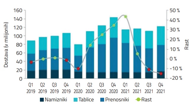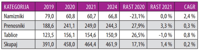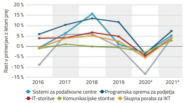 Leto pandemije COVID-19 ni bilo naklonjeno trgu IKT, ki je upadel za 5,4 odstotka, še manj celotnemu trgu naprav, ki se je zmanjšal za 13,4 odstotka, spodbudno pa je bilo za trg osebnih in tabličnih računalnikov, ki je porasel za 17 odstotkov. Analitiki za leto 2021 napovedujejo zmerno rast – trga IKT in trga naprav za po 4 odstotke ter PC-trga za 1,4 odstotka.