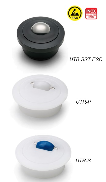 Za uporabo v transportnih in podajalnih enotah ali na koncu obdelovalnih linij so idealni kroglični valjčki UTR-P s tekalno površino iz belega termoplasta POM. Valjčki UTR-S iz mehkega modrega termoplasta so primerni za bremena s posebej občutljivimi površinami, kot sta steklo ali keramika. Omogočajo tako linearne premike kot tudi rotacijo zaradi sredinskega držala valjčka, ki se vrti neodvisno od zunanjega dela.
