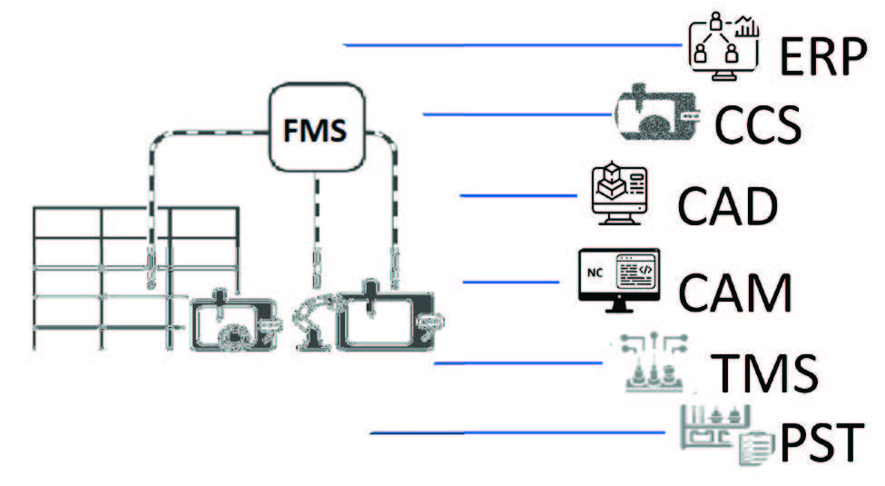 Sistem ERP omogoča neprekinjeno obdelavo naročil, vključno z upravljanjem zalog, upravljanjem skladišč in kontrolo proizvodnje. Na ta način omogoča optimalno vodenje in spremljanje delovnih procesov ter doseganje visoke stopnje izpolnitve rokov in spremljanja stroškov. ERP je z dvosmernim vmesnikom povezan s sistemom CCS, ki je neposredno povezan s sistemom FMS ter spremlja stanje operacij v tehnološkem planu za vsako pozicijo. Sistem CCS vodi proizvodni postopek v sistemu FMS tako, da aktivira hibridno napravo FCP 700/1400 za transport obdelovancev in palet. Sistem CCS poleg tega omogoča planiranje in upravljanje orodij in vpenjalnih priprav, koordinira prenos planskih, tehnoloških in proizvodnih podatkov v stroje ter določa čas začetka samodejne obdelave kosov. Za načrtovanje in organizacijo orodij, ki so potrebna za vsako operacijo, mora imeti sistem CCS tudi NC-program, ki je prilagojen njegovemu programskemu jeziku. NC-programi se generirajo s pomočjo postprocesorja v programih CAM z dodatnim vmesnikom, ki ga lahko razume sistem CCS. Začetek programa mora vsebovati seznam orodij, čas trajanja operacij, časovni načrt uporabe orodij, seznam strojev, na katerih se lahko izvaja program, ter odgovorno osebo za program. Ko sistem CCS izdela natančen plan proizvodnje v sistemu FMS, se ustvari seznam potrebnih orodij, ki se nato prek naprednega vmesnika pošlje v sistem TMS. Vsak seznam orodij je vezan na program, ki pa je naprej vezan na eno operacijo v enem naročilu.