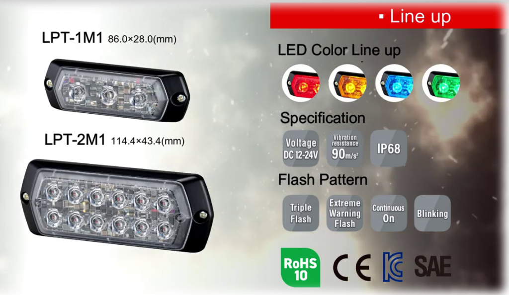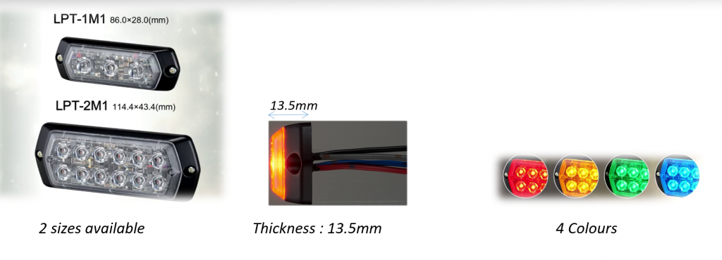 Na voljo so v dveh dimenzijah; model LPT-1M1 dimenzije 86 x 28 mm in model LPT-2M1 dimenzije 114,4 x 43,4 mm. Debelina ohišja svetila znaša le 13,5 mm, kar omogoča enostavno vgradnjo. Na voljo so štiri barve: rdeča, oranžna, zelena in modra, povežemo pa lahko do 20 enot skupaj, ki utripajo