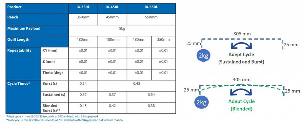 Adept (Omron je pred leti prevzel Adept) je za merjenje hitrosti svojih robotov ustvaril test, po katerem lahko robote med sabo primerjamo. Test sestavljajo gibi med tremi točkami, merijo pa se z različnimi obtežitvami. Ta način izračuna cikličnega časa tako imenujemo »Adeptov ciklični čas«.