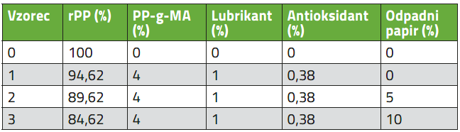 Izdelali smo 4 serije vzorcev in sicer je bil vzorec 0 kot referenca, kjer smo uporabili le rPP, vzorec 1 z dodatkom kompatibilizatorja, lubrikanta in antioksidanta, vzorec 2 z dodanimi 5 % odpadnega papirja in vzorec 3 z dodanimi 10 % odpadnega papirja. V tabeli 1 je prikazana sestava vzorcev.