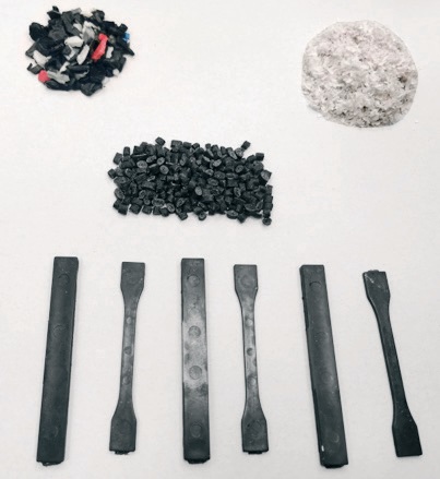 Slika 1: Reciklat polipropilena, odpadni papir, granulat biokompozita z 10 % odpadnega papirja in brizgani vzorci za testiranje