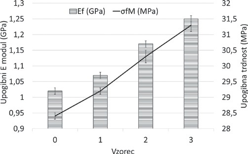 Dodatki v rPP matrici (antioksidant, lubrikant in kompatibilizator) zvišajo upogibni E modul (Ef) in upogibno trdnost (σfM) in hkrati znižajo raztezek pri upogibni trdnosti (ɛfM) (Sliki 2, 3). Dodatek odpadnega papirja v rPP z ostalimi dodatki še dodatno zviša Ef in σfM biokompozitu in še dodatno zniža ɛfM biokompozita. Najvišjo upogibno togost in trdnost ima biokompozit z dodanimi 10 % odpadnega papirja. 10 % dodatek odpadnega papirja zviša upogibno togost za 23 % in upogibno trdnost za 10 %, kot posledica dobrih medfaznih interakcij med odpadnim papirjem in rPP zaradi kompatibilizatorja PP-g-MA.
