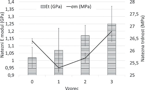 Dodatki v rPP matrici zvišajo natezi E modul (Et), znižajo natezno trdnost (σm), raztezek pri natezni trdnosti (ɛm) in raztezek pri pretrgu (ɛtb) (Sliki 4, 5). Pri biokompozitu z dodanimi 10 % odpadnega papirja se natezna togost poviša za 26 % in natezna trdnost za 2 % kot posledica dobrih medfaznih interakcij med odpadnim papirjem in rPP zaradi kompatibilizatorja PP-g-MA. Zaključimo lahko, da je PP-g-MA dober kompatibilizator za rPP in odpadni papir. Zelo dobre medfazne interakcije so se potrdile tudi pri DMA meritvah.