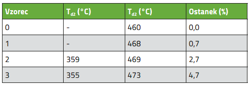 TGA analiza prikazuje enostopenjski razpad vzorcev 0 in 1. Temperatura degradacije se poviša pri vzorcu 1 zaradi dodatkov (antioksidant, lubrikant in kompatibilizator). Pri biokompozitih z dodanim odpadnim papirjem dobimo dvostopenjski razpad. Prvi razpad pri nižji temperaturi je razpad celuloznih vlaken v odpadnem papirju, drugi pri višji temperaturi je razpad rPP matrice z dodatki. Drugi razpad se premakne glede na vzorca brez odpadnega papirja k višjim temperaturam. Pri vzorcih 2 in 3 je bilo v odpadnem papirju 54 % in 47 % anorganskih polnil (Tabela 2). Dodatki in odpadni papir zvišajo temperaturo degradacije rPP zaradi dobrih madfaznih interakcij med odpadnim papirjem in rPP matrico, kar je skladno z upogibnimi, nateznimi in DMA rezultati.