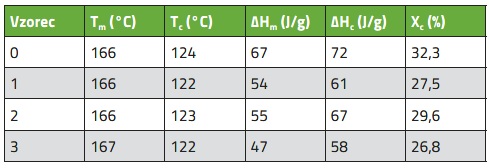 Diferenčno dinamično kalorimetrijo (DSC) smo izvedli na kalorimetru Mettler Toledo DSC 2 skladno z ISO 11357. Hitrost segrevanja in ohlajanja je bila 10 °C/min. Vzorce smo segrevali od 0 °C do 180 °C, pri 180 °C je sledil izotermni segment 5 min. Potem smo jih ohlajali od 180 °C do 0 °C, kjer je sledil izotermni segment pri 0 °C 5 min. Potem so se vsi koraki še enkrat ponovili. Vrednotili smo temperaturo kristalizacije (Tc), entalpijo kristalizacije (DHc), tališče (Tm) in talilno entalpijo (DHm) iz ohlajanja in drugega segrevanja. Izračunali smo stopnjo kristaliničnosti iz talilne entalpije drugega segrevanja (Enačba 1). Za talilno entalpijo 100 % kristaliničnega PP smo vzeli vrednost 207 J/g [3].