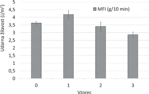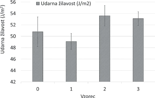 Preizkus udarne žilavosti smo izvedli po Charpy-ju na LY-XJJD5 s 5 J kladivom skladno z ISO 179. Vzorci so bili širine 10 mm in debeline 4 mm, razdalja med podporama je bila 60 mm. Pri vsakem vzorcu smo izmerili 10 paralelk in izračunali povprečje in standardni odmik.