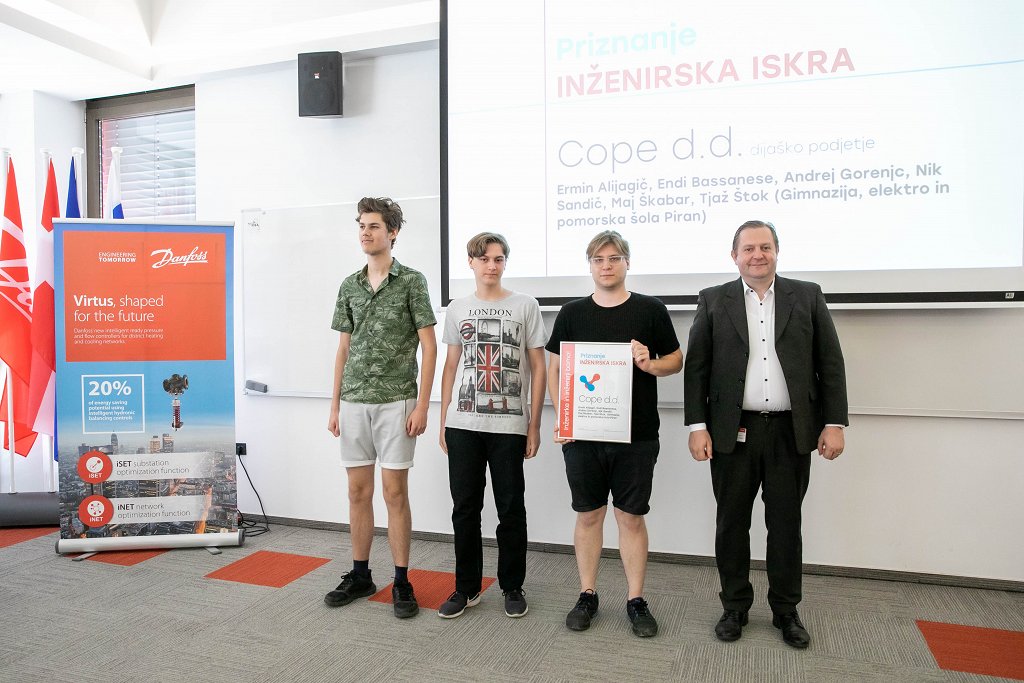 COPE D.D., dijaško podjetje in podeljevalec dr. Miha Bobič iz podjetja Danfoss Trata, predsednik iniciative Inženirke in inženirji bomo!COPE D.D., dijaško podjetje in podeljevalec dr. Miha Bobič iz podjetja Danfoss Trata, predsednik iniciative Inženirke in inženirji bomo!