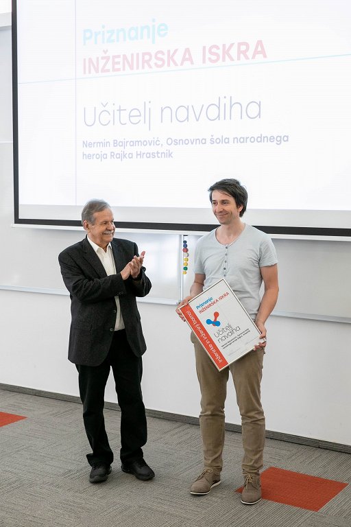 Nermin Bajramović, učitelj, ki matematiko uči z igrifikacijo in podeljevalec prof. dr. Stanislav Pejovnik, glavni tajnik Inženirske akademije SlovenijeNermin Bajramović, učitelj, ki matematiko uči z igrifikacijo in podeljevalec prof. dr. Stanislav Pejovnik, glavni tajnik Inženirske akademije Slovenije