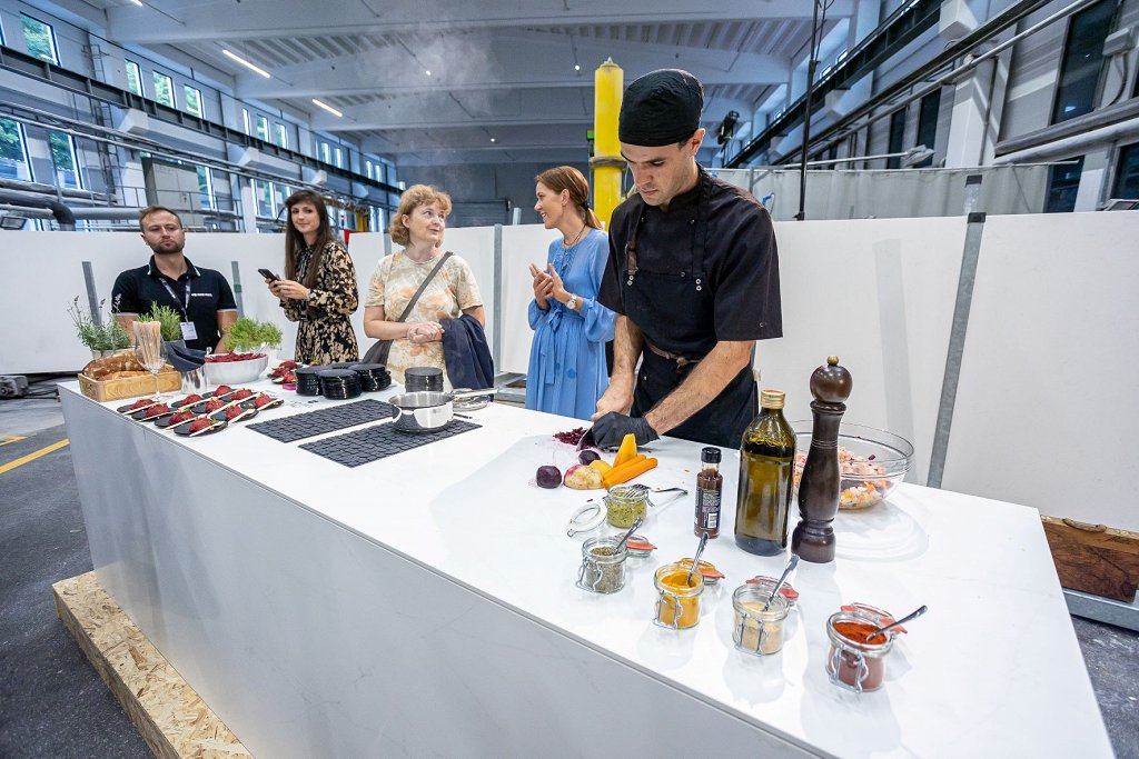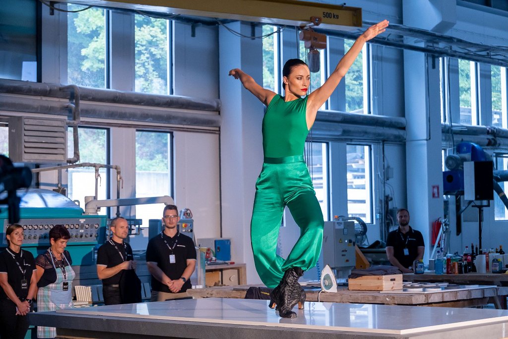Po novem materialu, ki je odporen skoraj na vse, Lapitecu, je flamenko odplesala znana glasbena ustvarjalka in plesalka Urška Centa ter po njem hodil povezovalec Boštjan Romih, na njem so z nožem rezali sadje in zelenjavo, pa se ni poznal ne nož, in se ni vpila niti žveplova kislina.