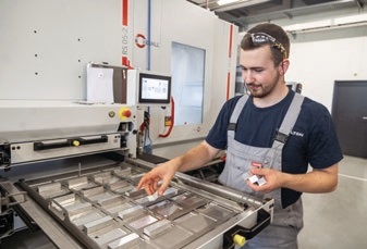 Fadri Pitsch postavlja surovce v zalogovnik, tako da bo na obdelovalnem centru dovolj surovcev za naslednjo izmeno brez prisotnosti operaterja. Vir: Hermle