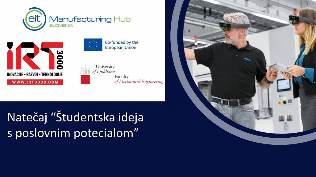 IRT3000 v sodelovanju z EIT Manufacturing Hub Slovenija in s podporo SPIRIT Slovenija vabijo na natečaj “Študentska ideja s poslovnim potencialom”, na katerega se lahko prijavi vsak študent / študentski tim, ki ima(jo) idejo / inovacijo s poslovnim potencialom na področju proizvodnih tehnologij, novih izdelkov, digitalizacije, čistih procesov, pametnih tovarn in industrijskih rešitev.
