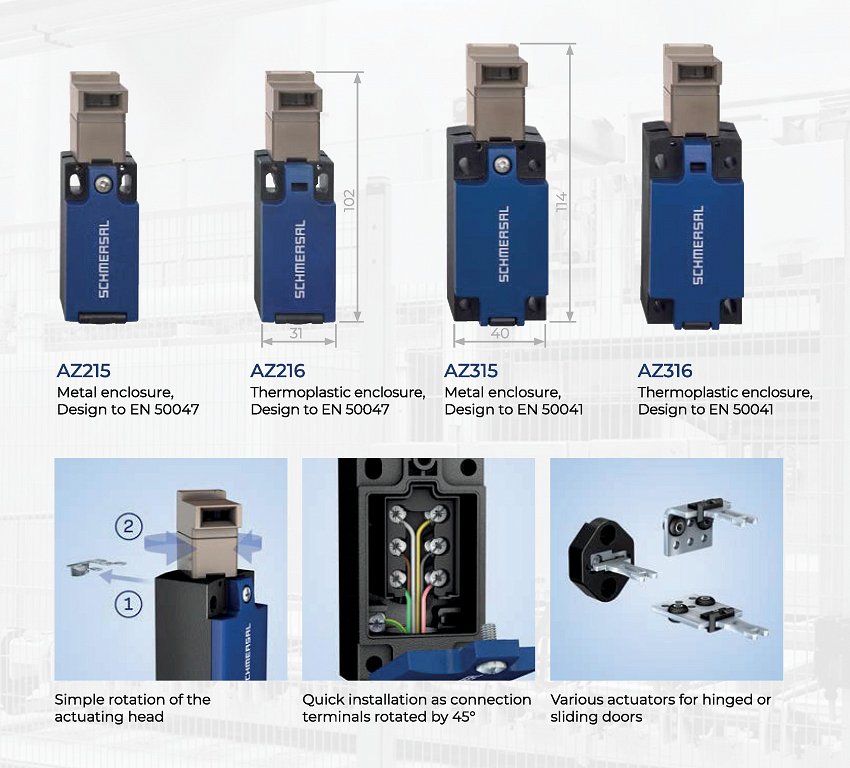 Schmersalova elektromehanska varnostna stikala serije AZ, AZ 215/AZ 216 in AZ 315/AZ 316 imajo ločen aktuator. Namenjena so nadzoru položaja tako drsnih kot tečajnih zaščitnih vrat.